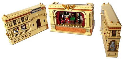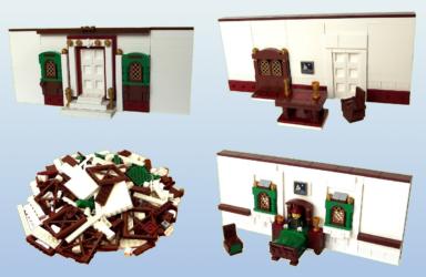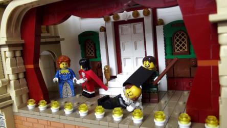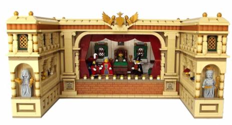 Dieses Lego-Set besteht aus 3 trennbaren modularen Elementen, zu denen die Theaterbühne, die Flügel, die Kleiderkreisbox und zwei Räume hinter der Bühne gehören: das Arbeitszimmer des Schauspielers und das Ankleidezimmer der Schauspielerin.