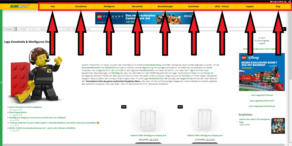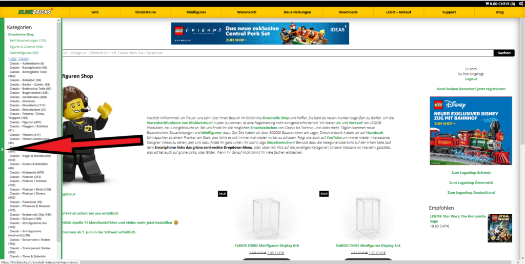Mit der Menuleiste oben gelangst Du zur Gesammtübersicht diverser Themenbereiche. z.B Übersicht über alle Figuren, alle Bausteinchen, Set oder Heft Bauanleitungen ect.
