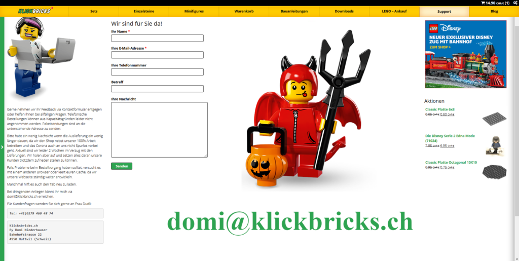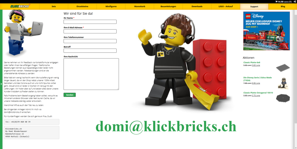 Grundsätzlich nehmen wir aus Kapazitätsgründen keine telefonische Bestellannahme entgegen. Auch Offerten können wir aus zeitlichen Gründen NICHT bearbeiten. Nütze dazu unsere Suchfunktion und den Warenkorb. Wir geben in der Regel keine Auskunft über Teile-Fragen. Anonyme Anrufe werden nicht angenommen. Bei Fragen benütze das Kontaktformular oder um ganz sicher zu sein sende Deine Frage direkt an: domi@klickbricks.ch