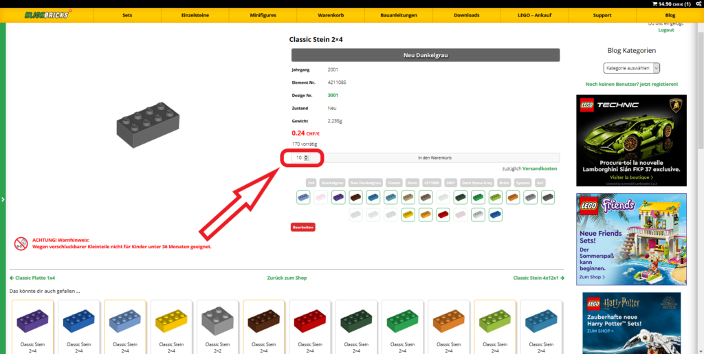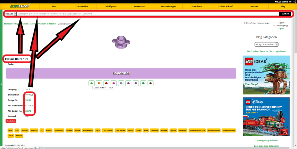 Wir haben gleich mehrere Optionen zur Suche eingebaut. Im Suchfeld oben kannst Du wenn bekannt die Design-Nummer oder die Farbnummer des Bausteines eingeben. Die findest Du z.B. in der Bauanleitung auf der letzten Seite. Bei den Legosteinen ist es so das jeder eine Nummer hat. Mit einer Lupe oder mit Adleraugen findest Du die Nummer auf dem Baustein. Diese ist in der Regel in unserem System hinterlegt. Wenn Du einen Suchbegriff eingegeben hast warte ein zwei Sekunden ohne mit Enter zu bestätigien, dann taucht ein Dropdown mit den hinterlegten Steinchen auf.
