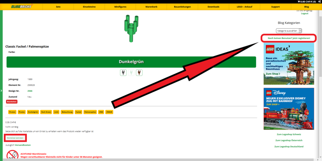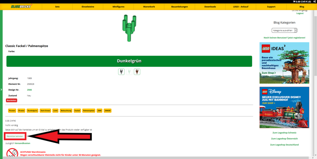 In die Warteliste kannst Du Dich eintragen wenn wir Dich benachrichtigen sollen, falls das gewünschte Bausteinchen wieder verfügbar ist. Leder sind einige Teile wirklich selten, daher können wir keine Zeitangabe dazu machen wann dieses Teil wieder verfügbar sein wird. Um die Warteliste benützen zu können musst Du angemeldet sein. Klicke hier um Dich anzumelden