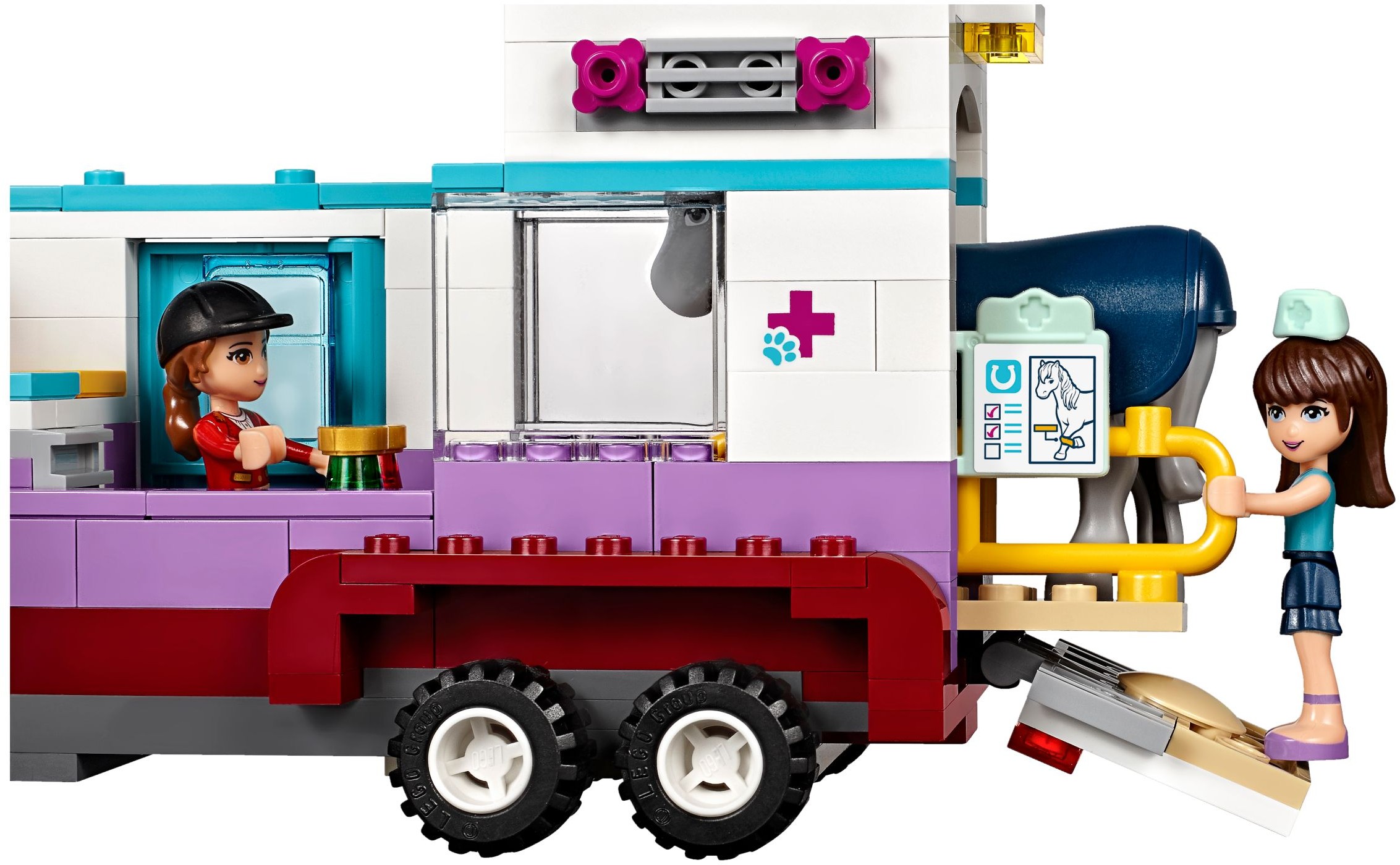 Der LEGO® Friends Pferdeanhänger mit Tierärtzin enthält alle nötige Ausrüstung, um Ponys direkt vor Ort gut versorgen zu können. Das dazugehörige Auto lässt sich abkoppeln und der Anhänger kann auf unterschiedliche Weise geöffnet werden, um das Spielen im Anhänger zu erleichtern. Enthält die Spielfiguren Olivia und Sophie sowie ein Pferd.