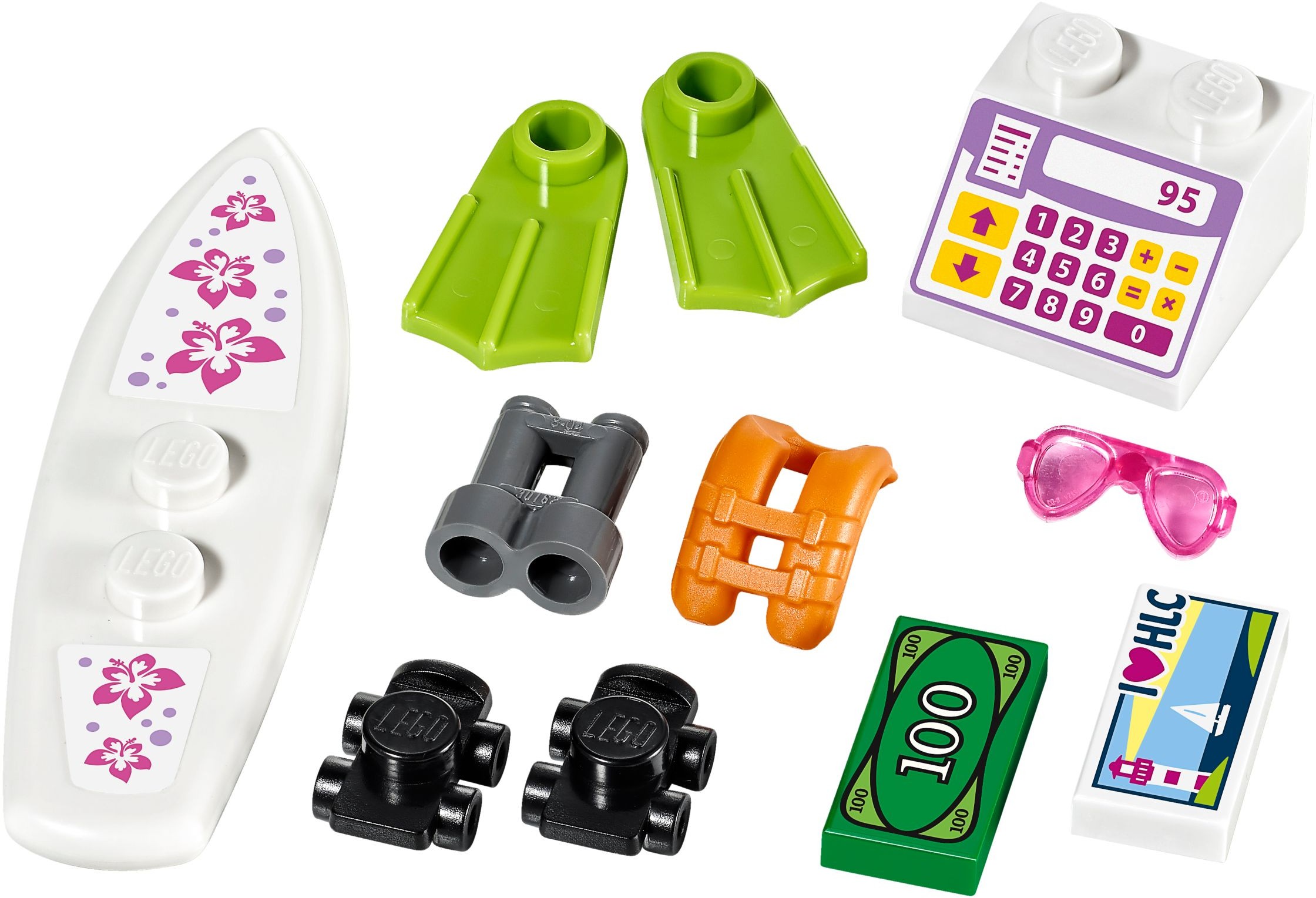 Der LEGO® Friends Heartlake Surfladen enthält eine Registrierkasse und unterschiedlichste Urlaubsartikel. Leih dir verschiedene Wassersportausrüstungen aus. Es gibt Surfbretter, ein Kajak mit Paddel, Schwimmflossen und eine wasserfeste Kamera. Draußen gibt es einen Strandabschnitt mit Sonnenliege und Dusche, einen Steg mit Bojen sowie einen Felsen, der von einem Seehund bewohnt wird. Enthält eine Spielfigur.
