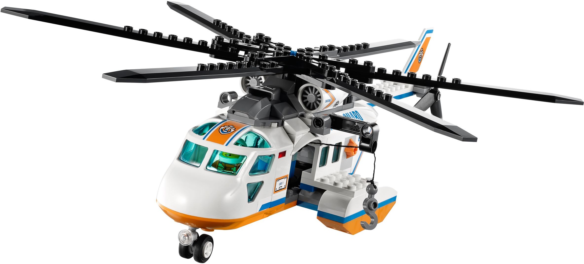 Halte mit dem Hubschrauber der Küstenwache Ausschau nach dem Segler, der mit seinem Segelkatamaran in Seenot geraten ist! Du kannst sogar die Segel setzten! Finde das Wrack, bevor der Hai dir zuvorkommt! Lass den Taucher an der automatischen Winde herab und hilf dem Rettungsschwimmer, den Segler mithilfe des Rettungsrings aus dem Wasser zu ziehen. Wenn ihr sicher an Bord des Helikopters seid, könnt ihr nach LEGO® City zurückkehren!