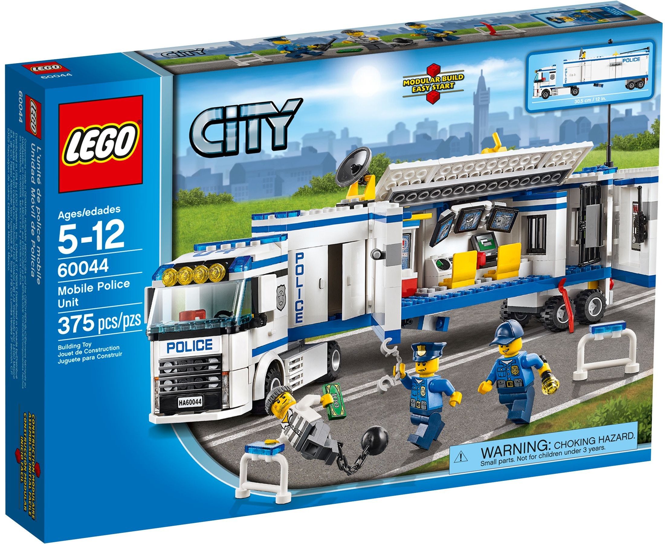 Parke den Polizei-Überwachungs-Truck, fahre die Satellitenschüssel und Antenne aus und spüre den Ganoven auf. Setze die Überwachungsbildschirme im Hightech-Kontrollraum ein, um den Ganoven, der sich mit dem Geld aus dem Staub machen will, aufzuspüren und ihn zu verfolgen. Nimm ihn fest und sperre ihn in die mobile Gefängniszelle. Sorge dafür, dass er nicht versucht auszubrechen, wenn die Polizisten einen Kaffee trinken. Enthält 3 Minifiguren sowie passende Ausrüstung: 2 Polizisten und einen Ganoven.