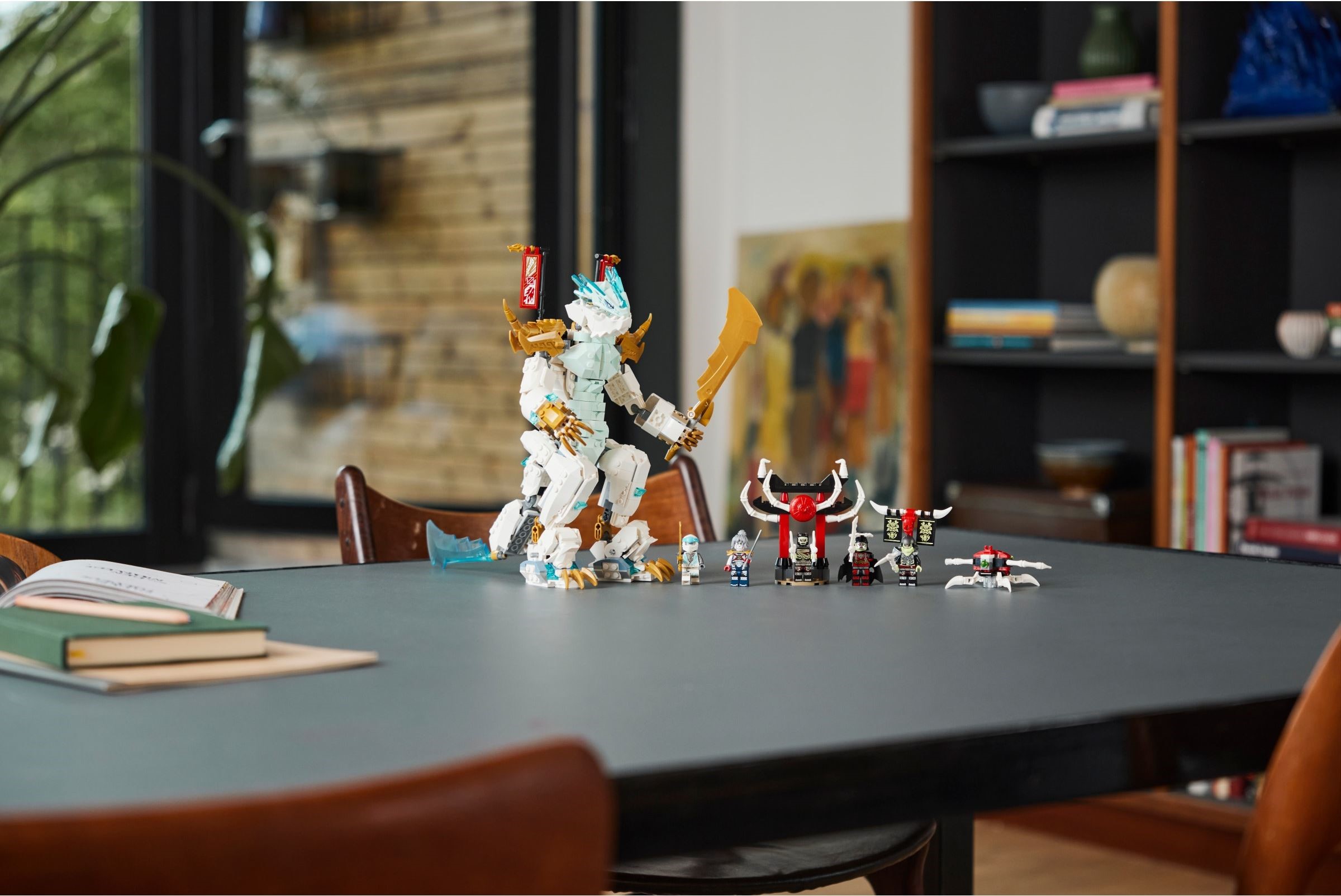 Mit den scharfen Eisklauen, den Hörnern, dem Schwanz und dem Eisatem ist dieser Drache nicht zu unterschätzen! Wenn du das Duell gewonnen hast, kannst du das Modell in einen imposanten 2-beinigen Drachenkrieger verwandeln, der eine große goldene Klinge schwingt. Mit diesem Set hast du die Wahl zwischen 2 megastarken Drachenmonstern, um NINJAGO® City vor Angriffen zu beschützen!
