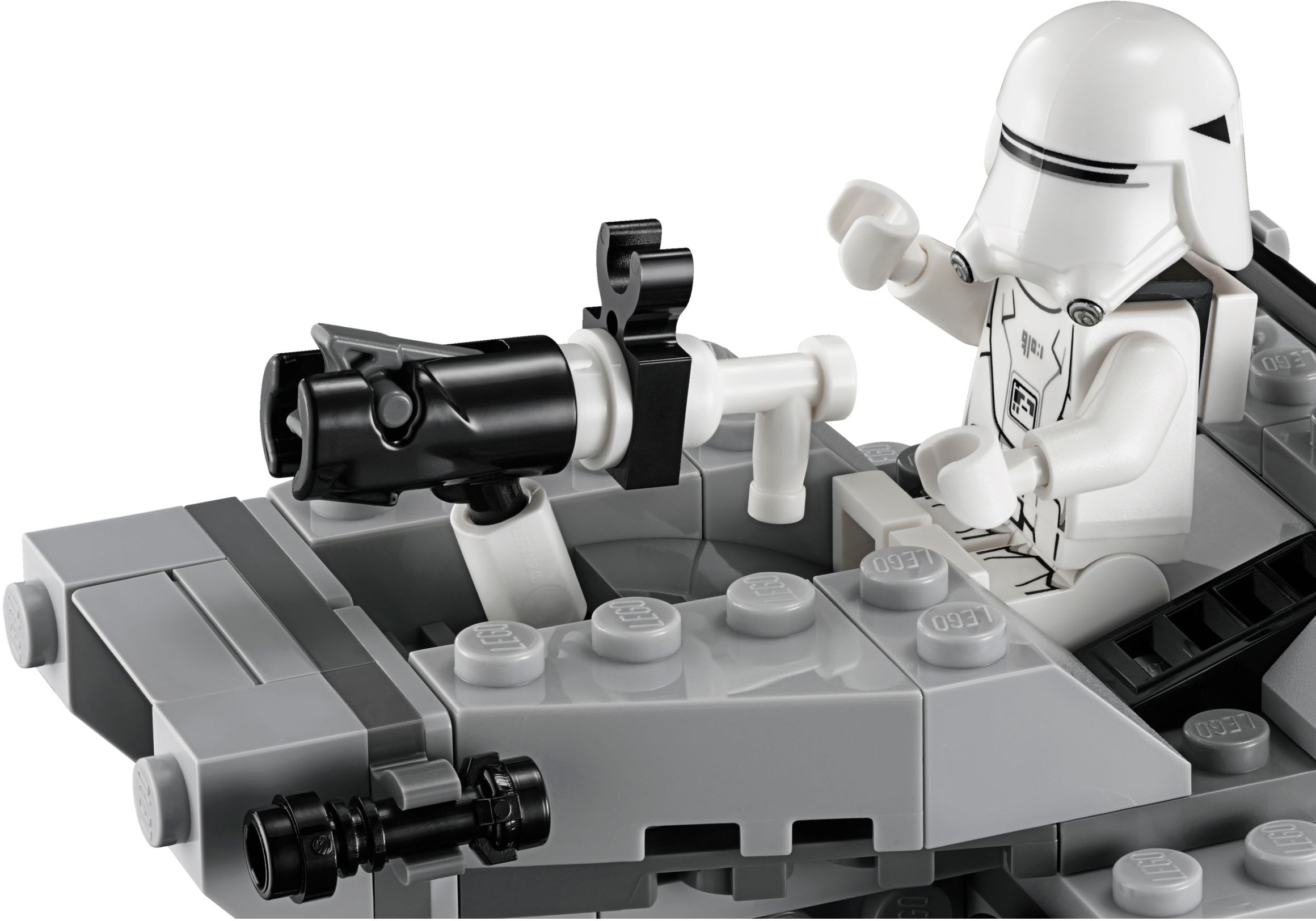 Donnere mit der Microfighter-Version des First Order Snowspeeder los, um den Gegner abzufangen. Der Snowspeeder verfügt über große Triebwerke, einen rotierenden Shooter sowie genügend Platz, um die beiliegende Minifigur eines First Order Snowtrooper aufzunehmen.