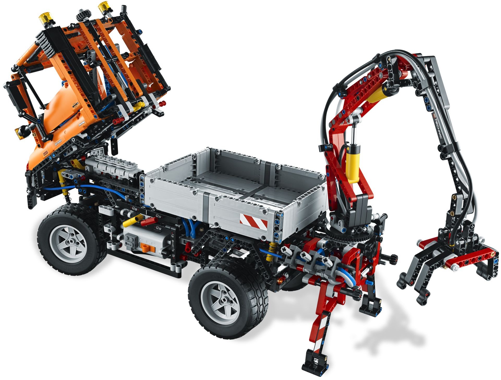 Dem vielseitigen Mercedes-Benz Unimog U 400 ist keine Aufgabe zu groß! Mit einem pneumatisch angetriebenen Gelenkkran, funktionierendem Greifer und einer Bergungswinde an der Vorderseite – dieses mechanische Monster wird von LEGO® Power Functions angetrieben. Das Hightech-Design verfügt über eine funktionierende Lenkung, Allradantrieb und Federung, einen Getriebeblock für extreme Bodenfreiheit und einen detaillierten Motor mit beweglichen Kolben. Baue den Kran und die Winde zu einem riesigen Schneepflug um.