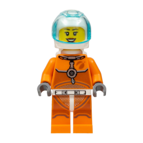 Astronaut - Female, Orange Spacesuit with Dark Bluish Gray Lines, Trans-Light Blue Visor, Open Mouth Smile