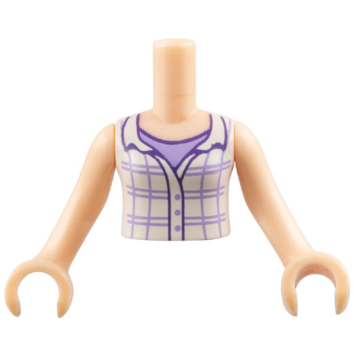 | Englische Bezeichnung | Torso Mini Doll Girl White Plaid Button Top Sleeveless with Open Collar over Lavender Shirt Pattern, Light Nougat Arms with Hands |