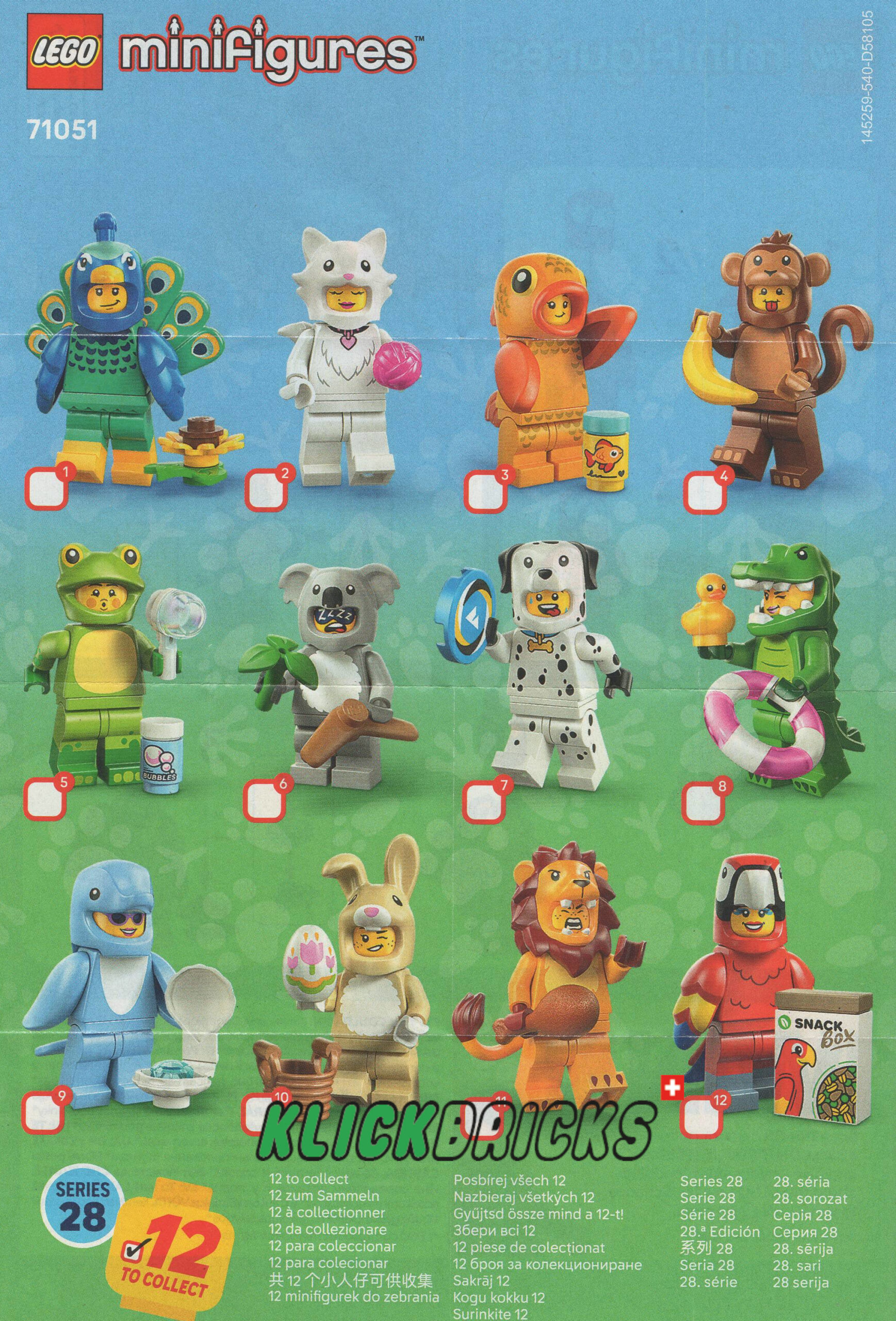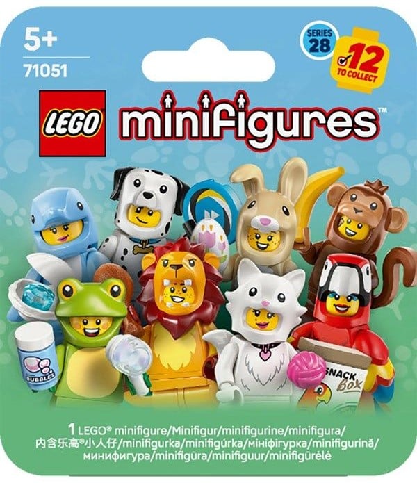LEGO® Minifiguren Tiere Serie 28 (71051) besteht aus 12 Überraschungsboxen mit kleinen Figuren in Tierkostümen, die Kinder ab 5 Jahren spannende Geschichten darstellen lassen. Jede Überraschungsbox enthält 1 LEGO Minifigur. Insgesamt umfasst die Serie 12 Minifiguren in Tierkostümen, die einen Papagei, einen Löwen, einen Frosch, ein Krokodil, einen Dalmatiner, einen Goldfisch, ein niedliches Häschen, einen Pfau, eine flauschige Katze, einen Koala, einen Delfin und einen Affen darstellen. Jede dieser 12 Minifiguren steckt zusammen mit mindestens einem Zubehörteil in einer versiegelten Überraschungsbox. Diese detailgetreuen Minifiguren in Tierkostümen ergänzen vorhandene Sammlungen, sind die Hauptdarsteller spannender Geschichten und begeistern als süße Zimmerdeko. Diese Minifiguren sind ein schönes kleines Geschenk für Kinder, die Tiere und die Natur lieben. Sie laden zu packenden Rollenspielen ein und bieten stundenlangen Spielspaß – auch zusammen mit anderen Kindern.