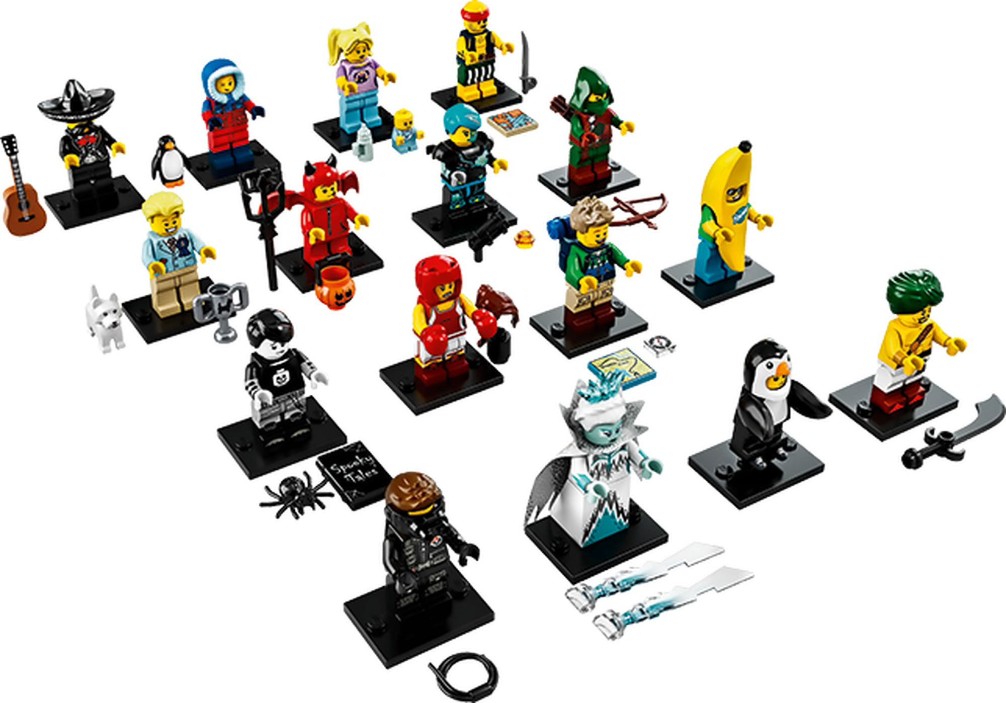 - Jeder Minifigur liegen ein oder mehrere Zubehörteile sowie eine Stellplatte und eine Sammlerbroschüre bei.