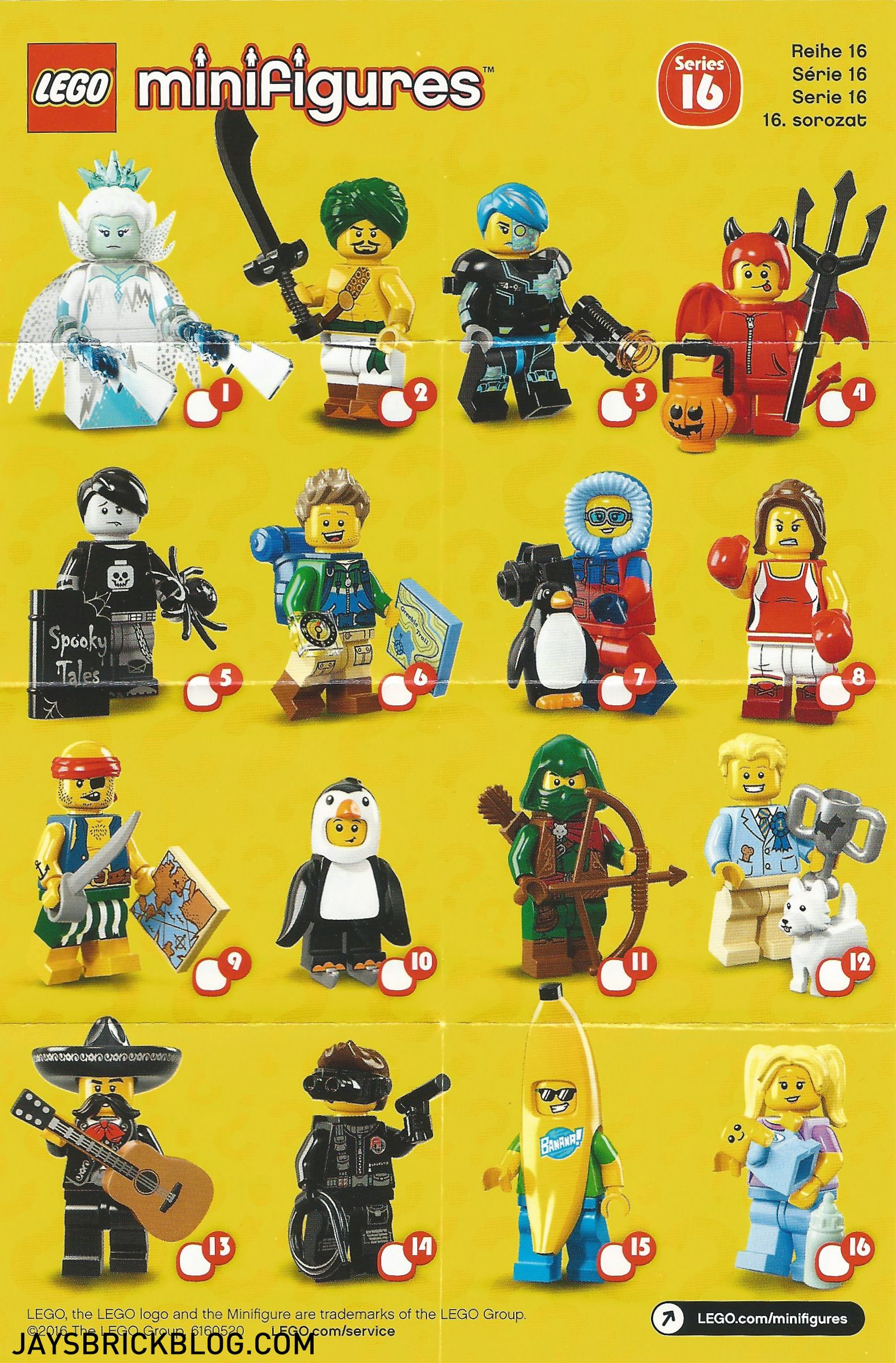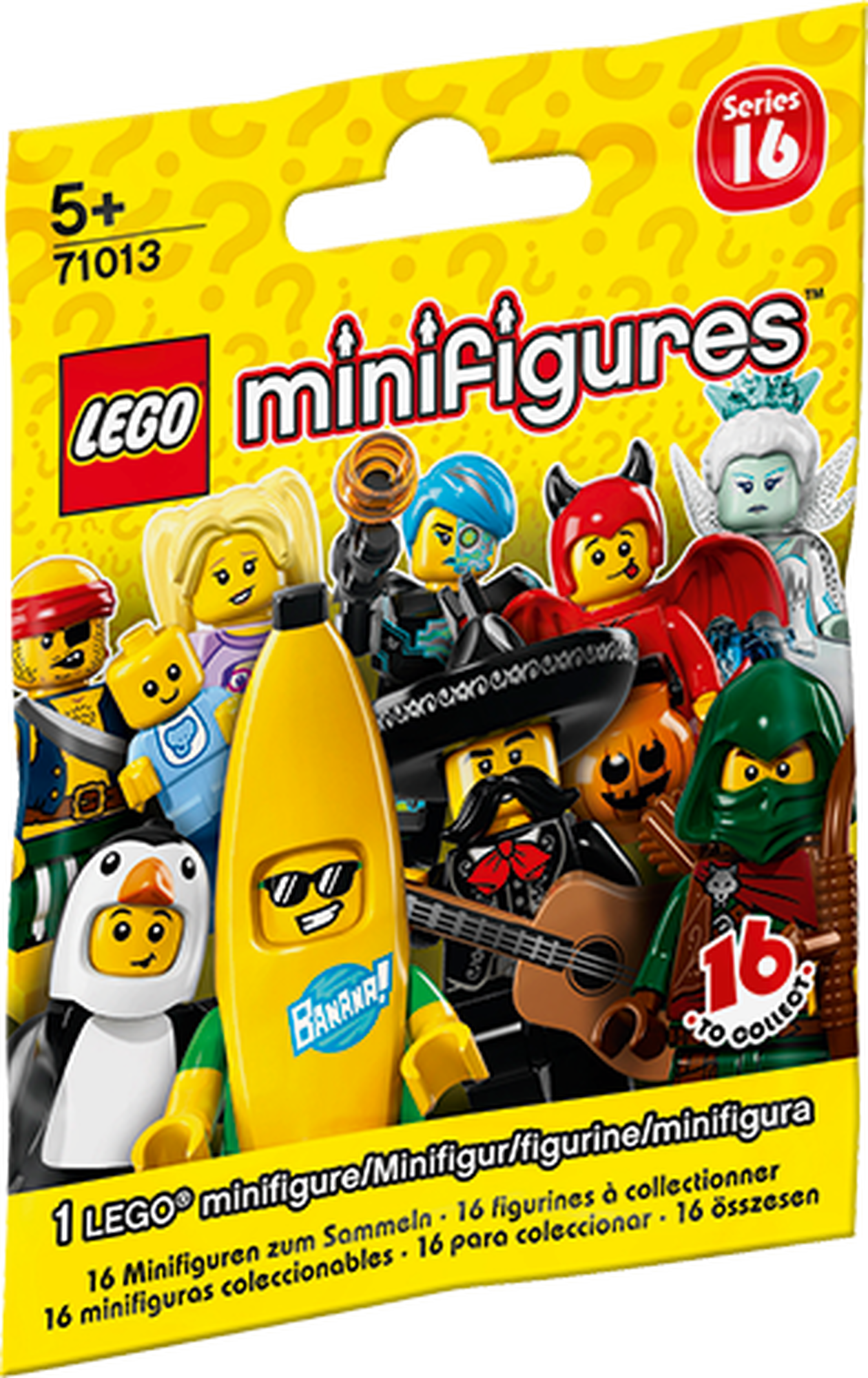 Mit den neuen Minifiguren aus der LEGO Minifiguren-Sammlung eröffnen sich dir völlig neue Spieloptionen. Die Serie 16 enthält folgende Minifiguren: Wüstenritter, Pinguin-Junge, Eiskönigin, Spion, Bananen-Mann, Wanderer, Kickboxerin, Grufti, Räuber, Cyborg, Kleiner Teufel, Hundeschau-Sieger, Piratenstrolch, Babysitter, Wildfotograf und Mariachi. Jede Minifigur befindet sich in einer verschlossenen „Überraschungstüte“, die außerdem Zubehör, eine Stellplatte und eine Sammlerbroschüre enthält.