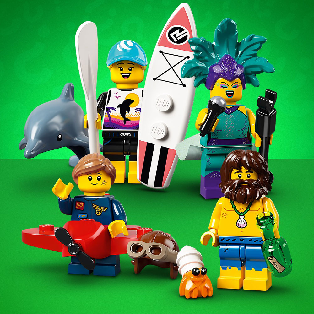 Kinder und Erwachsene können sich auf eine tolle Auswahl an Minifiguren in limitierter Auflage freuen: Zentaur, Schiffbrüchiger, Kostüm-Junge, Imker, Marienkäfer-Mädchen, Geigenspieler, Alien-Bösewicht, Weltraumpolizist, Stammeskämpfer, Flugzeug-Mädchen, Kabarett-Sängerin und Stand-up-Paddler.