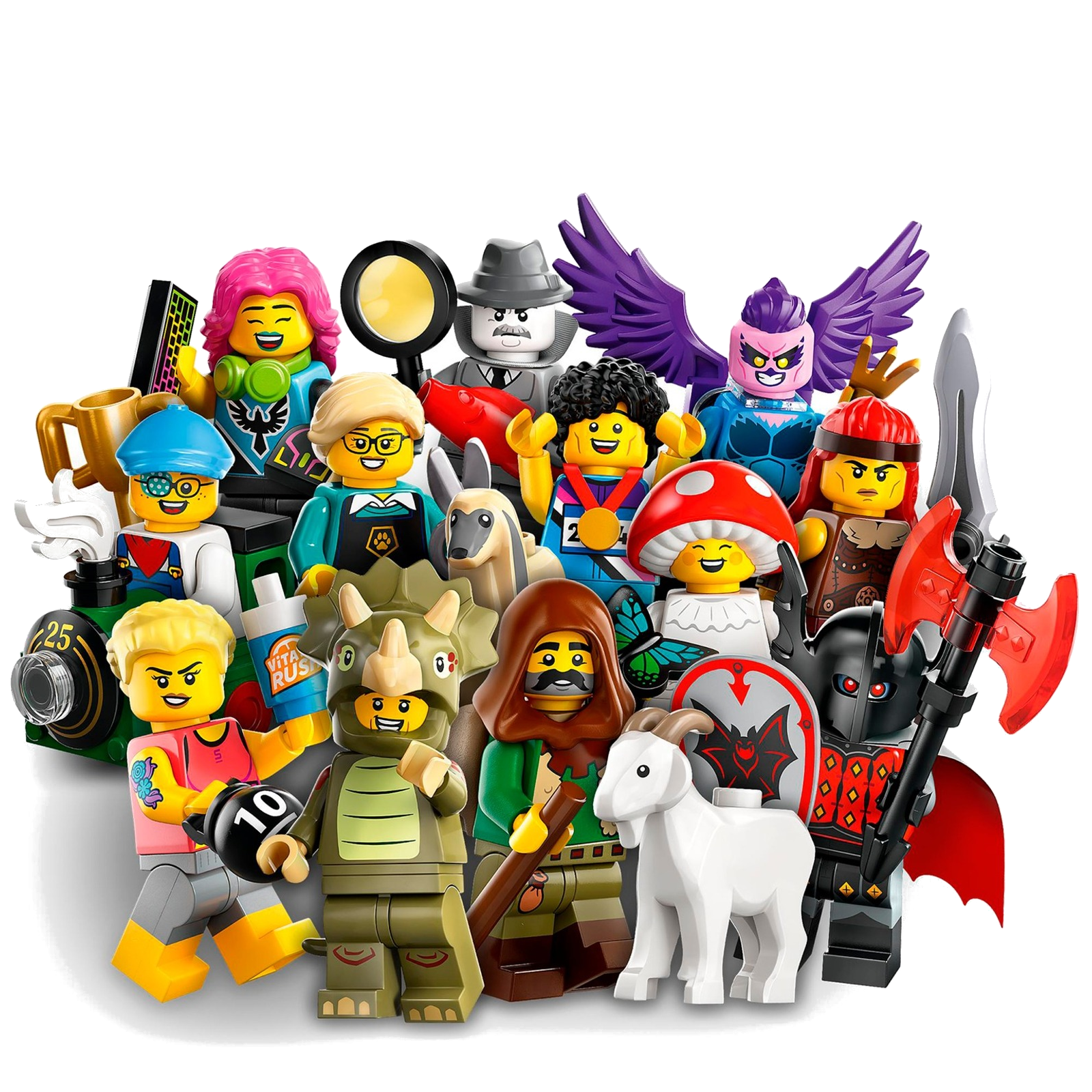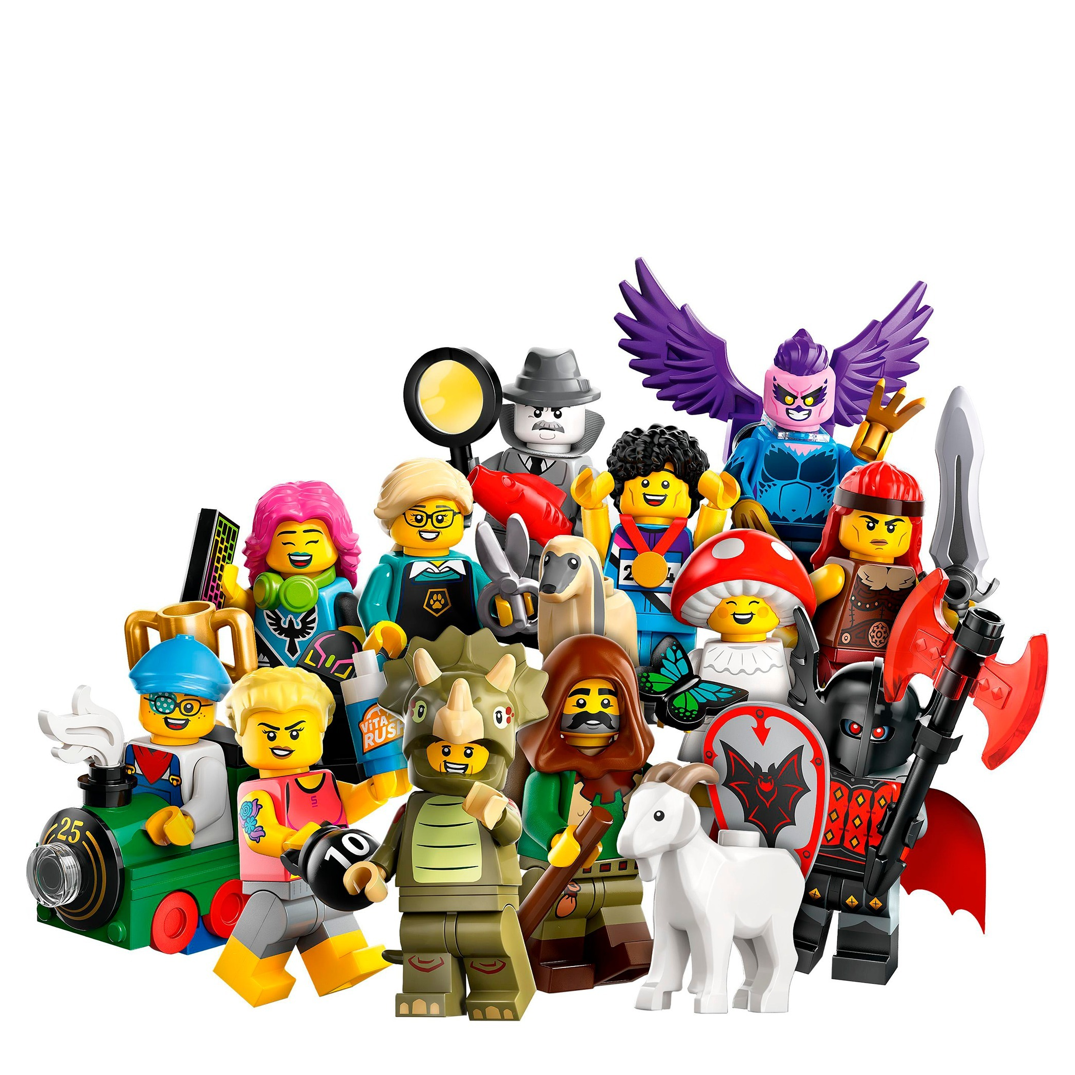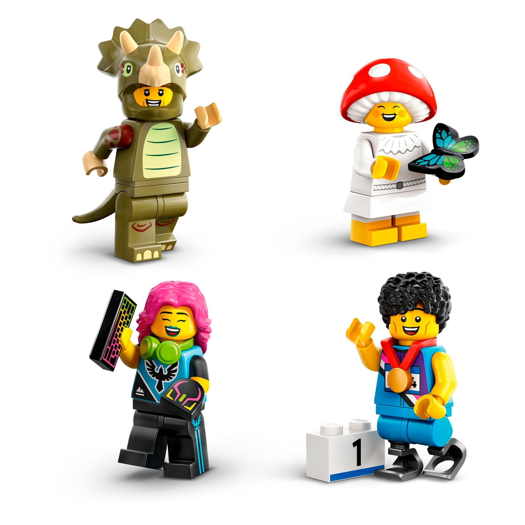 In jeder Überraschungsbox befindet sich 1 LEGO Minifigur. Insgesamt umfasst die Serie 12 Figuren zum Sammeln: Triceratops-Fan, Sprinter, Film Noir Detektiv, Junge mit Zug, Ziegenhirte, Vampir-Ritter, Hundefriseurin, Fitness-Trainerin, E-Sports Gamerin, Fliegenpilz, Barbarin und Harpy.
