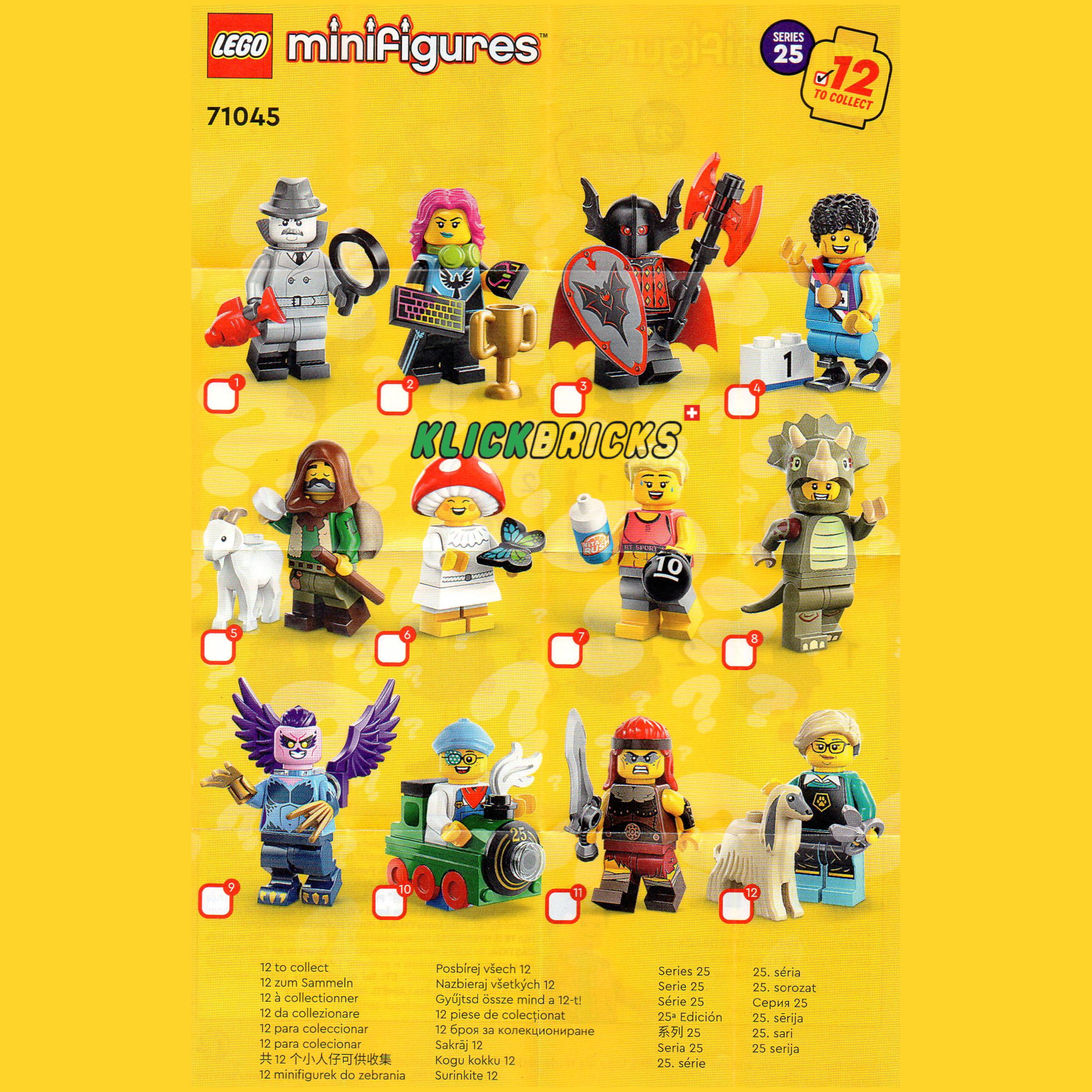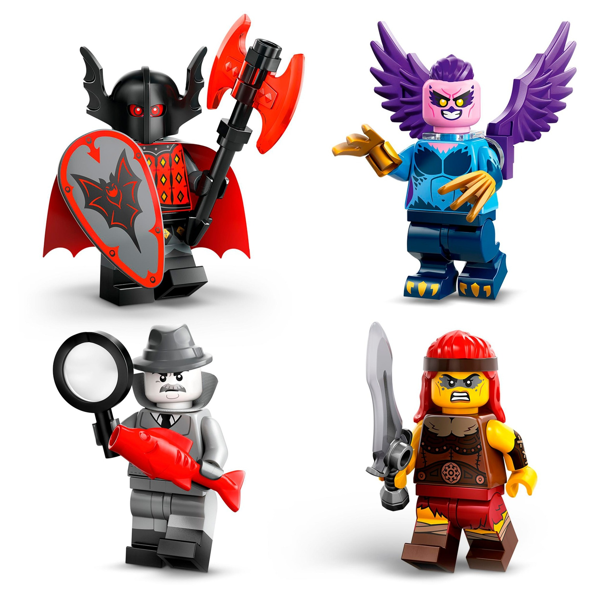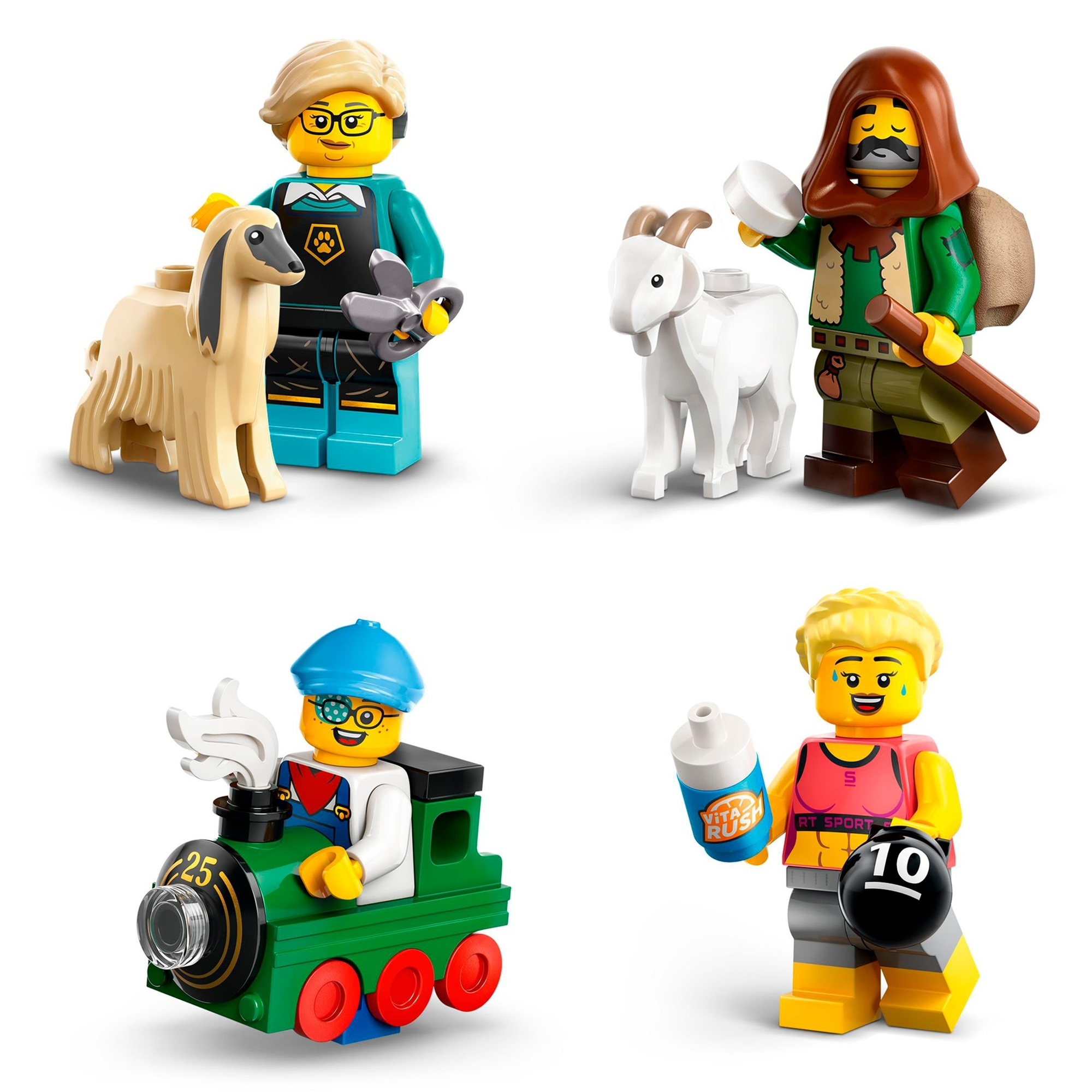 In jeder Überraschungsbox befindet sich 1 LEGO Minifigur. Insgesamt umfasst die Serie 12 Figuren zum Sammeln: Triceratops-Fan, Sprinter, Film Noir Detektiv, Junge mit Zug, Ziegenhirte, Vampir-Ritter, Hundefriseurin, Fitness-Trainerin, E-Sports Gamerin, Fliegenpilz, Barbarin und Harpy.